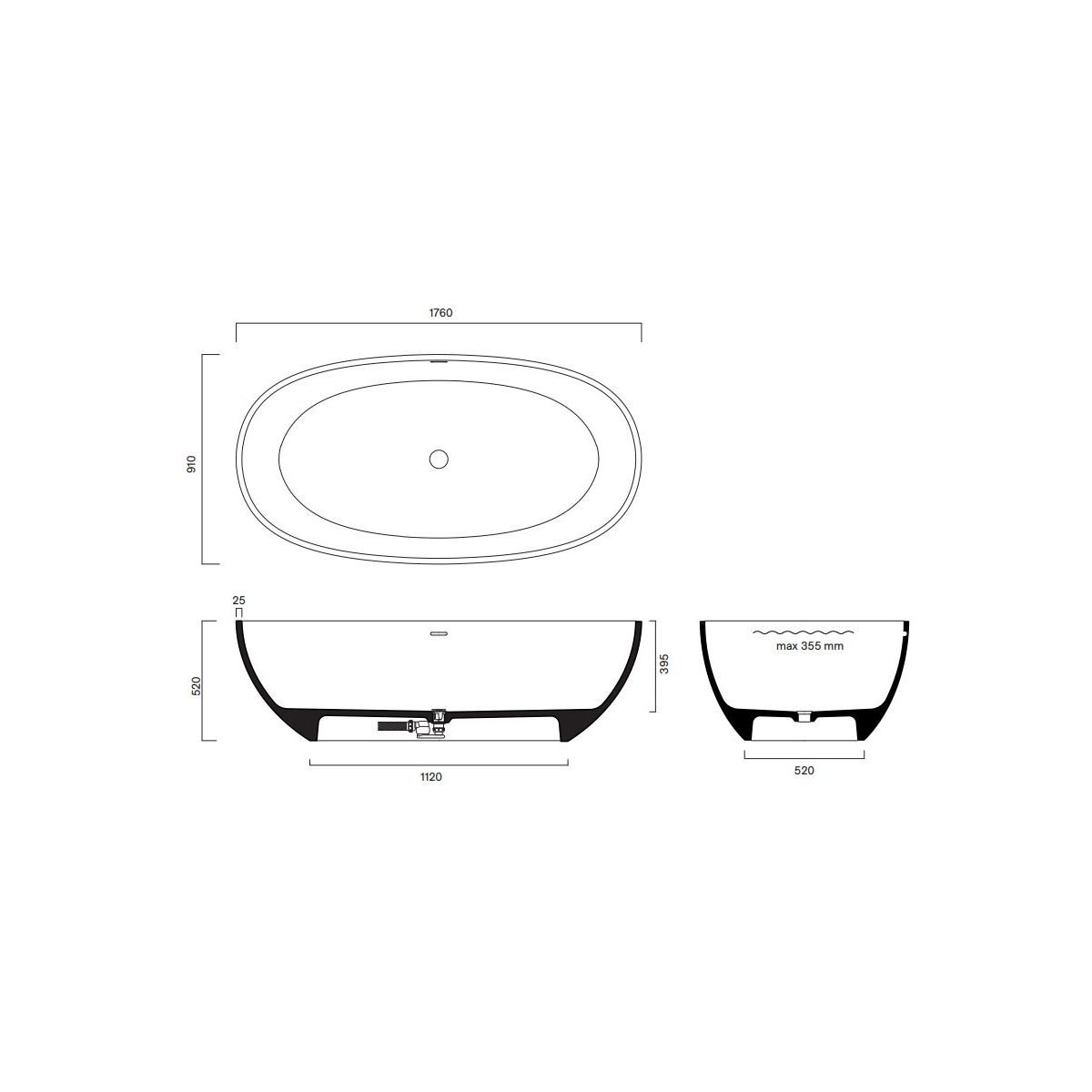 Oválna voľne stojaca vaňa z antibakteriálneho kompozitného materiálu, vyrobená z jedného kusu, s prepadom, vybavená zátkou v rovnakom vyhotovení s mechanizmom click-clack a sifónom na úrovni podlahy.