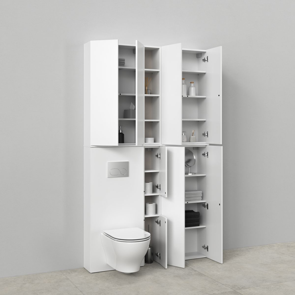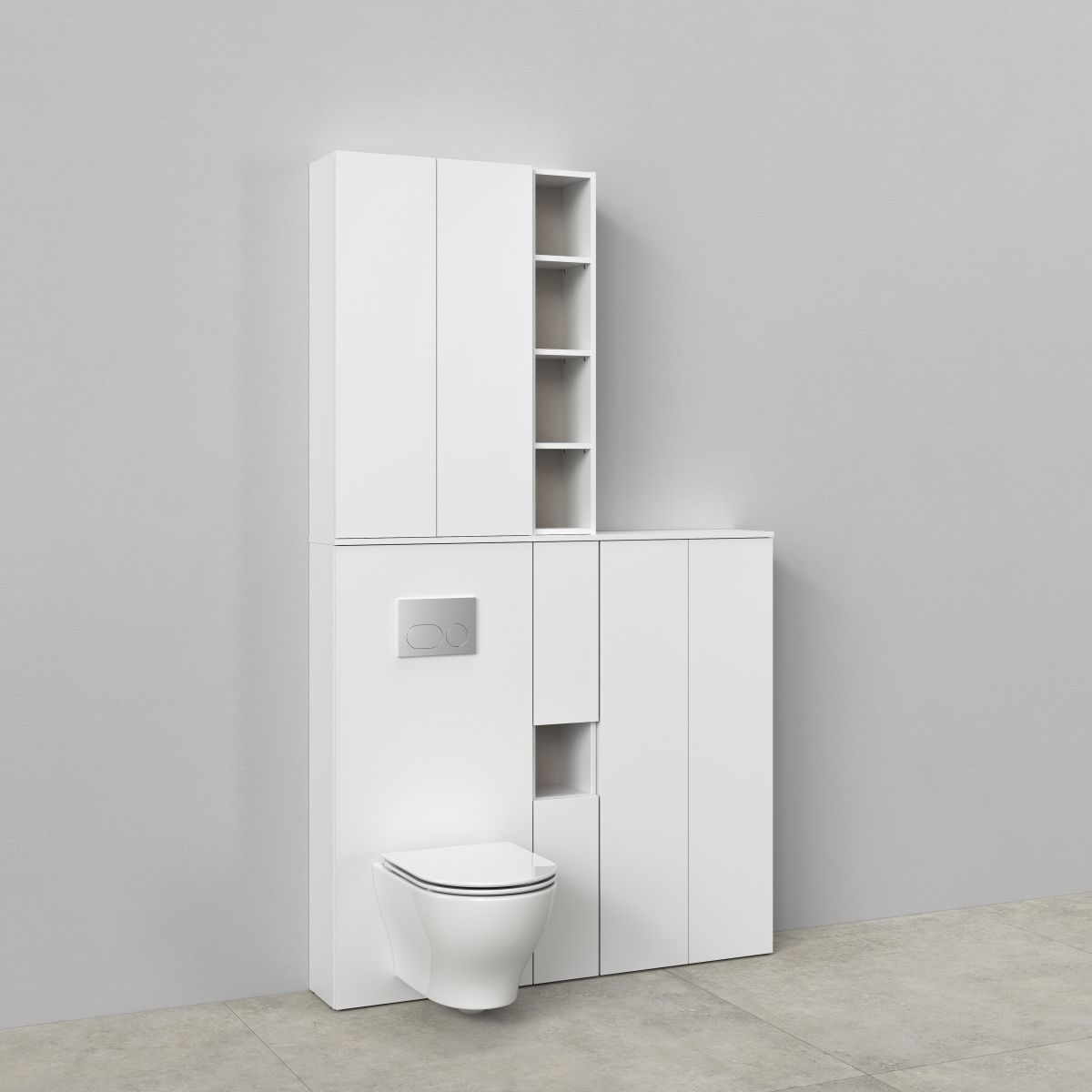 Skrytá inštalácia je ďalším prvkom, ktorý podčiarkuje modulárny charakter kolekcie Milagros. Vďaka svojej estetike a výnimočnej funkčnosti je ideálnym riešením pre moderné kúpeľne. Biela matná povrchová úprava dodáva základnej jednotke jemnú eleganciu, ktorá dokonale ladí s ostatnými prvkami kúpeľňového vybavenia. Skrytá WC jednotka účinne zakrýva všetky technické komponenty WC systému, čím kúpeľni dodáva estetický vzhľad. Vďaka nábytkovej skrinke môžeme ľahko a rýchlo skryť predstenovú inštaláciu, čím odpadá nutnosť zasahovať do obkladov. Pre túto vstavanú zostavu je potrebné zakúpiť špeciálnu dosku v závislosti od toho, aké usporiadanie chceme vybudovať.
