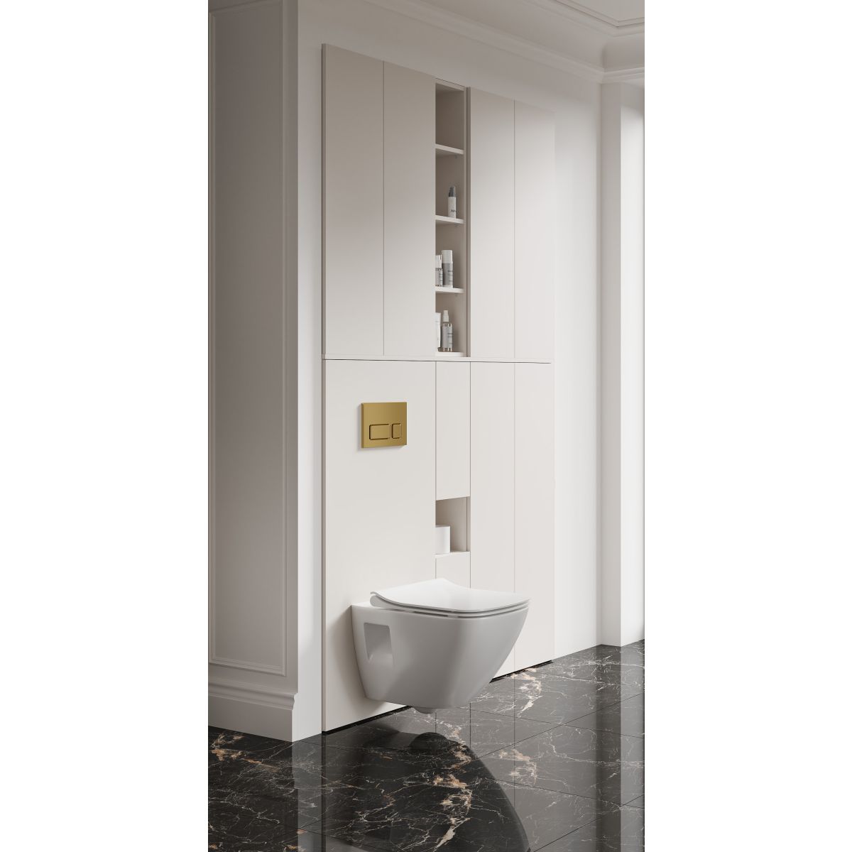 Podpultová skrinka je ďalším prvkom, ktorý zdôrazňuje modulárny charakter kolekcie Moduo. Vďaka svojej estetike a výnimočnej funkčnosti je ideálnym riešením pre moderné kúpeľne. Kašmírový matný povrch dodáva spodnej skrinke jemnú eleganciu, ktorá sa dokonale kombinuje s ostatným kúpeľňovým vybavením. Skryté WC obloženie účinne zakrýva všetky technické komponenty WC systému a dodáva kúpeľni estetický vzhľad. Vďaka nábytkovému krytu môžeme ľahko a rýchlo skryť predstenovú inštaláciu, čím odpadá nutnosť zasahovať do obkladov. Pre túto vstavbu je potrebné zakúpiť špeciálnu dosku v závislosti od toho, aké usporiadanie chceme vybudovať.