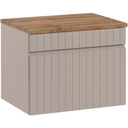 Kašmírová matná farba súpravy v kombinácii s dubovou hornou doskou v odtieni Coast Evoke jej dodáva moderný a dizajnový vzhľad. Úchytky v kašmírovej farbe dokonale ladia s ostatným nábytkom a vytvárajú súdržný celok. Súprava sa skladá z dvoch prvkov: skrinky pod umývadlo (komponent 1) a dosky (komponent 2), ktoré sa navzájom dokonale dopĺňajú.