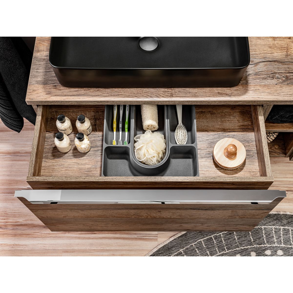 Kúpeľňová doska z laminovanej dosky vo farbe dub Vintage. Nevyhnutná súčasť pri vytváraní zostáv s ostatnými výrobkami z tejto série.