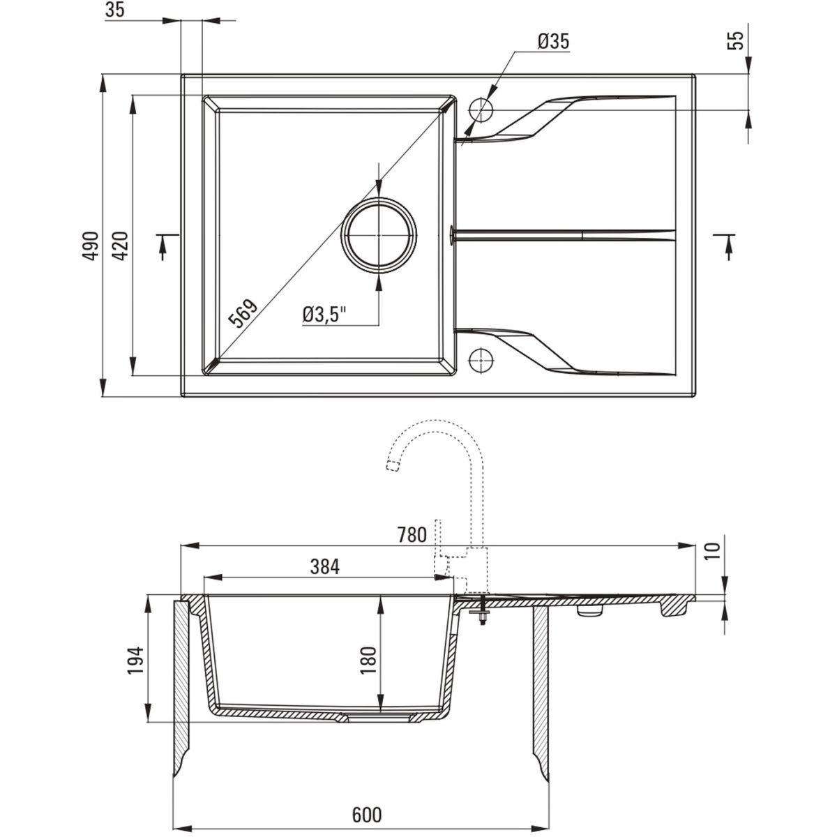 - priemer odtoku: 3,5''