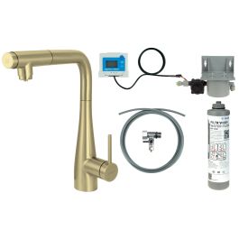 Kuchynská batéria Eridan s filtrom vody je jedinečným riešením, ktoré spája eleganciu, funkčnosť a starostlivosť o zdravie. Štíhly tvar batérie s povrchovou úpravou z brúseného zlata dodáva kuchyni sofistikovaný charakter. Telo, ktoré sa smerom k spodnej časti jemne rozširuje, dodáva celku ľahký a harmonický vzhľad. Je to však viac než len batéria – vďaka zabudovanému filtračnému systému sa Eridan stáva zdrojom čistej a zdravej vody. Stačí stlačiť tlačidlo Click na výtoku, aby ste prešli na filtrovanú vodu, ktorá je dodávaná priamo z filtra cez samostatnú hadicu. Toto riešenie nielenže eliminuje potrebu ďalších džbánov alebo fliaš, ale tiež pomáha chrániť životné prostredie tým, že znižuje spotrebu plastov. Súčasťou balenia je sada filtrov, ktorá účinne odstraňuje chlór, ťažké kovy, piesok a iné nečistoty, čím zlepšuje chuť a vôňu vody. To znamená, že ju môžete bez obáv podávať svojej rodine, používať na varenie alebo prípravu nápojov. Praktický monitor signalizuje, kedy je potrebné vymeniť filtračnú vložku, čím je zabezpečená konzistentná kvalita vody každý deň. Celý systém sa rýchlo a ľahko inštaluje a jeho každodenné používanie je intuitívne a pohodlné. Eridan nie je len elegantným kuchynským zariadením, ale predovšetkým investíciou do zdravia a pohodlia. Spája modernú estetiku s ekologickým prístupom a dôrazom na detaily, vďaka čomu je vaša kuchyňa ešte funkčnejšia a jedinečnejšia.