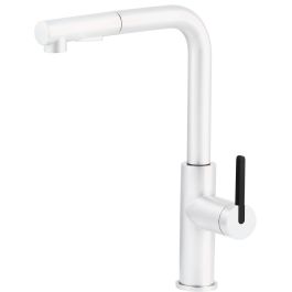 Batéria Momi, vyrobená z najkvalitnejšej nehrdzavejúcej ocele, zaujme moderným obdĺžnikovým tvarom výtoku, ktorý jej dodáva jedinečný charakter. Vstavaný perlátor prevzdušňuje prúd vody, čo umožňuje efektívne znížiť spotrebu vody bez straty intenzity prietoku. Výsuvný výtok poskytuje úplnú voľnosť pohybu, čo uľahčuje každodenné kuchynské práce, vrátane tých, ktoré vyžadujú prístup na ťažko dostupné miesta. K dispozícii sú dva typy prúdu – jemný, provzdušnený prúd ideálny na umývanie a mäkký prúd podobný dažďu, ktorý je perfektný na oplachovanie zeleniny a ovocia. Celok dopĺňa elegantná matná biela povrchová úprava, ktorá do kuchyne vnáša jemnú eleganciu a modernú ľahkosť.