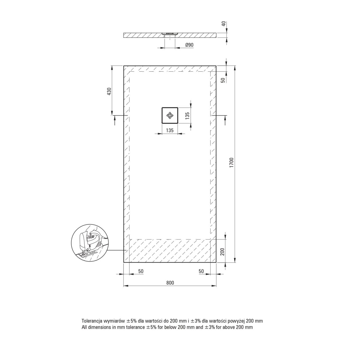 - Technológia SOLID PLUS - kompozitná výplň, možnosť rezania sprchovej vaničky v oblasti vyznačenej na výkrese