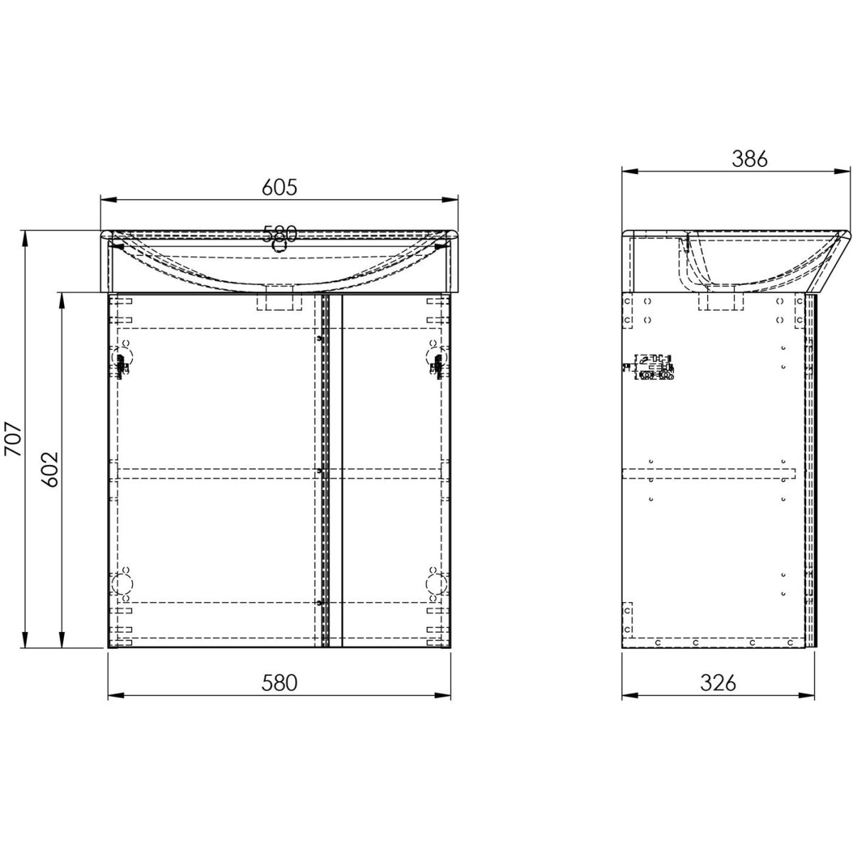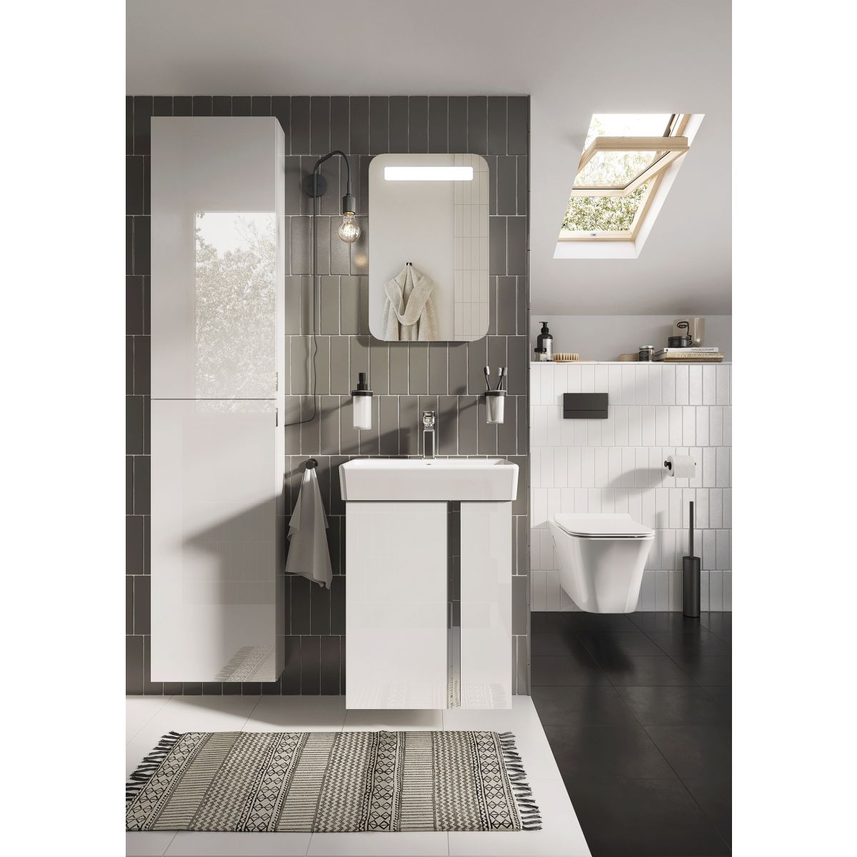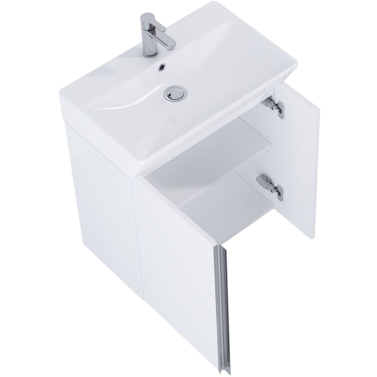 Súprava Skye 60 cm, vybavená asymetrickými dvierkami so systémom tichého zatvárania a výškovo nastaviteľnou policou. Súprava je vyrobená z vysokokvalitných materiálov, predná časť a korpus z vysokolesklej lakovanej dosky v bielej farbe. Chrómovaná kovová úchytka je umiestnená vertikálne, po celej výške skrinky. Súprava sa skladá zo skrinky pod umývadlo a umývadla s elegantne profilovanou misou. Súprava vyzerá skvele so skrinkami z kolekcie For All.