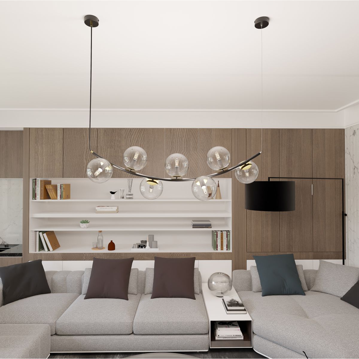 Vneste do svojho interiéru jednoduchosť minimalistického dizajnu so závesným svietidlom RITZ. Je vyrobené z ocele v čiernej farbe a dokonale ladí s priehľadným tienidlom. Svietidlo v tvare polkruhu s nepravidelne rozmiestnenými tienidlami dodáva interiéru jedinečný nádych a zdôrazňuje jeho moderný a rafinovaný štýl. Táto lampa je ideálnou voľbou pre tých, ktorí chcú oživiť svoj interiér a vytvoriť osvetlenie, ktoré je funkčné a zároveň estetické. Vyrobené v Poľsku.
