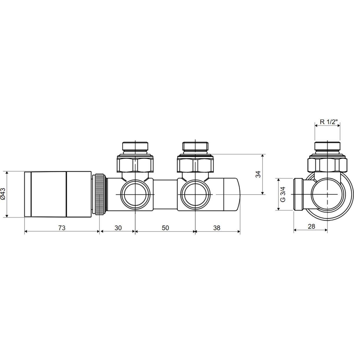 Termostatická súprava Caldo so spodným pripojením s rozstupom 50 mm. Umožňuje presnú kontrolu teploty a reguláciu prietoku vody, čím zabezpečuje optimálny výkon vykurovacieho systému.