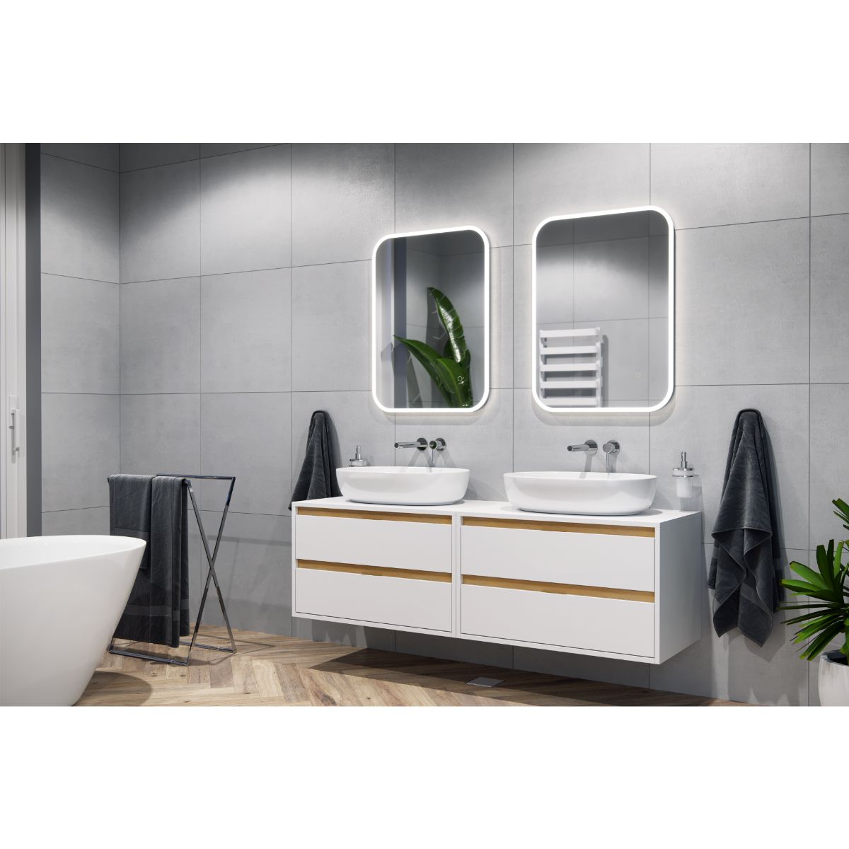 Lumiro je kúpeľňové zrkadlo vyrobené z vysoko kvalitného zrkadlového skla (sklo potiahnuté reflexnou vrstvou striebra) s LED podsvietením, ktoré plynule mení farbu v rozmedzí 3000-6000K. Podsvietenie je skryté pod akrylovým rámom, čo zaisťuje rovnomerné rozptýlenie svetla bez viditeľných LED bodov.