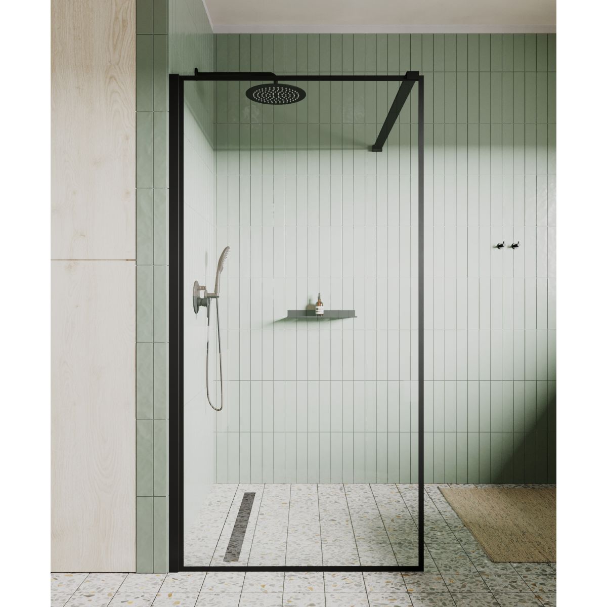 - pevná sprchová stena, typ walk-in