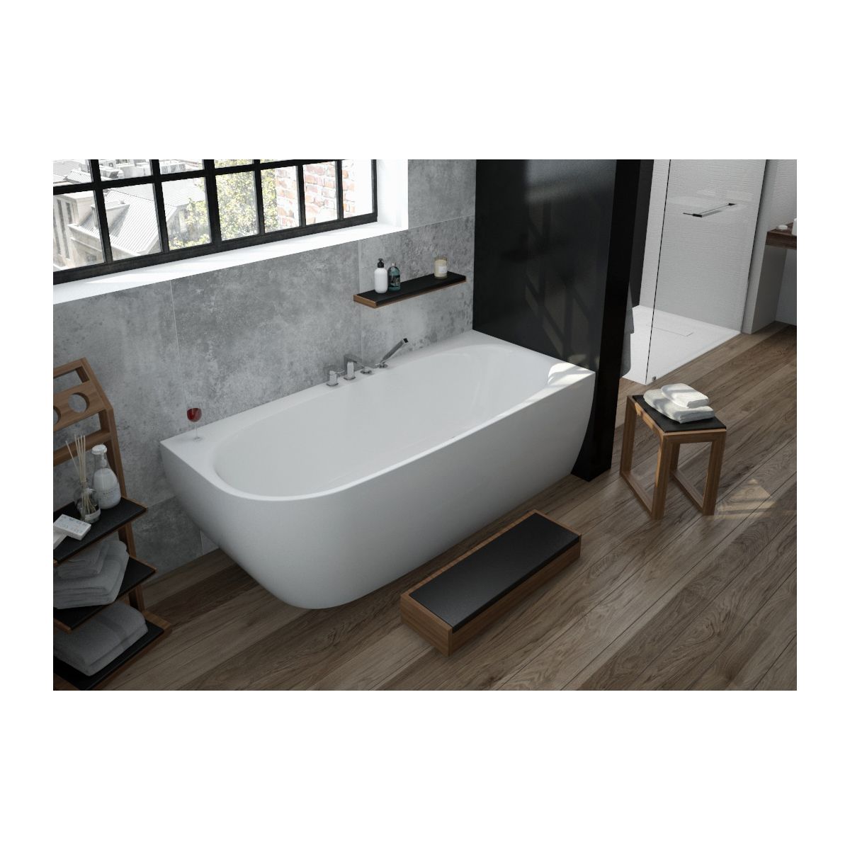 * kompletná pravá rohová vaňa obsahuje: integrovaný prepadový systém s funkciou napúšťania, odtokový systém so zátkou Klick-Klack, pripojovaciu inštalačnú hadicu.