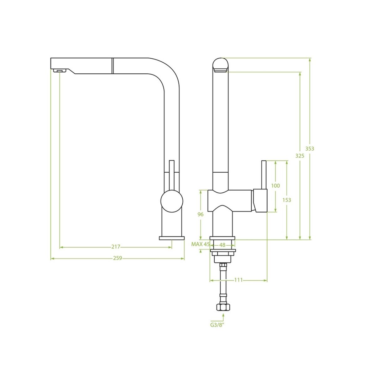 - dosah výtoku: 217 mm