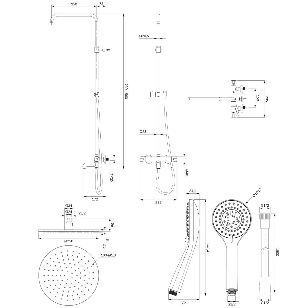 V súprave: batéria s prepínačom, hlavová sprcha, vaňové výlevky, sprchová hlavica , sprchová hadica, sprchová tyč