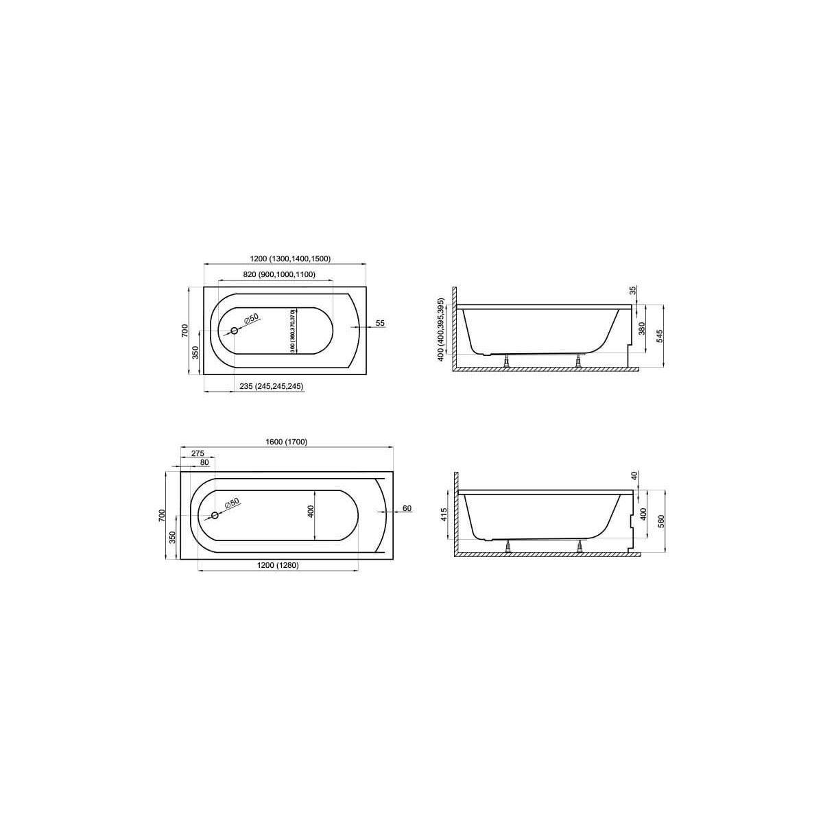 Polimat Classic obdĺžniková vaňa 130x70 cm biela 00134