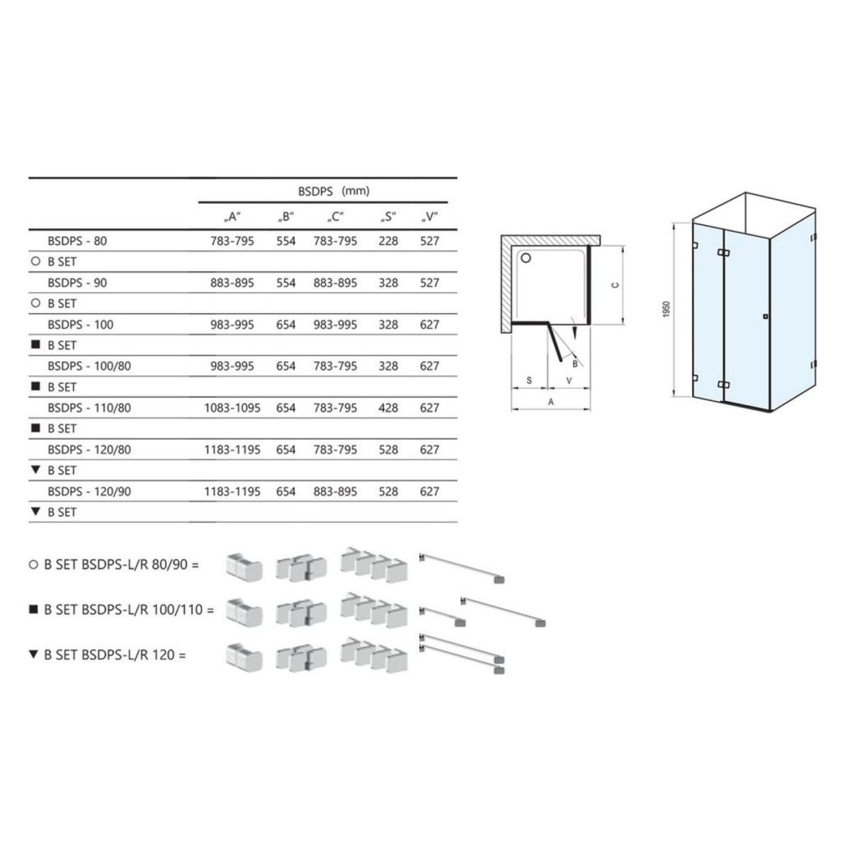 Sprchový kút sa skladá z dvoch častí sprchových dverí (s jedným pevným prvkom a jedným pohyblivým prvkom, ktorý tvorí dvere) a jednodielnej pevnej steny. Verzia produktu pre ľavú alebo pravú stranu je určená umiestnením pántov pri pohľade zvonku. Zdvihací mechanizmus zaisťuje dvere v základnej polohe, automaticky ich zatvára a pri otváraní ich zdvíha nad prahovú lištu. Ľavá sklenená verzia sa dá kombinovať iba s ľavým B SET. Inštalácia v obkladanom rohu kúpeľne na sprchovú vaničku Ravak: Perseus Pro, Perseus Pro Flat, Perseus Pro Chrome alebo priamo na podlahu s vstavaným lineárnym odtokom alebo odtokovou mriežkou. Sprchový kút BSDPS sa dodáva ako sada: sklenené prvky v jednom balení a kovové časti a jeden dlhý držiak v druhom balení (B SET).