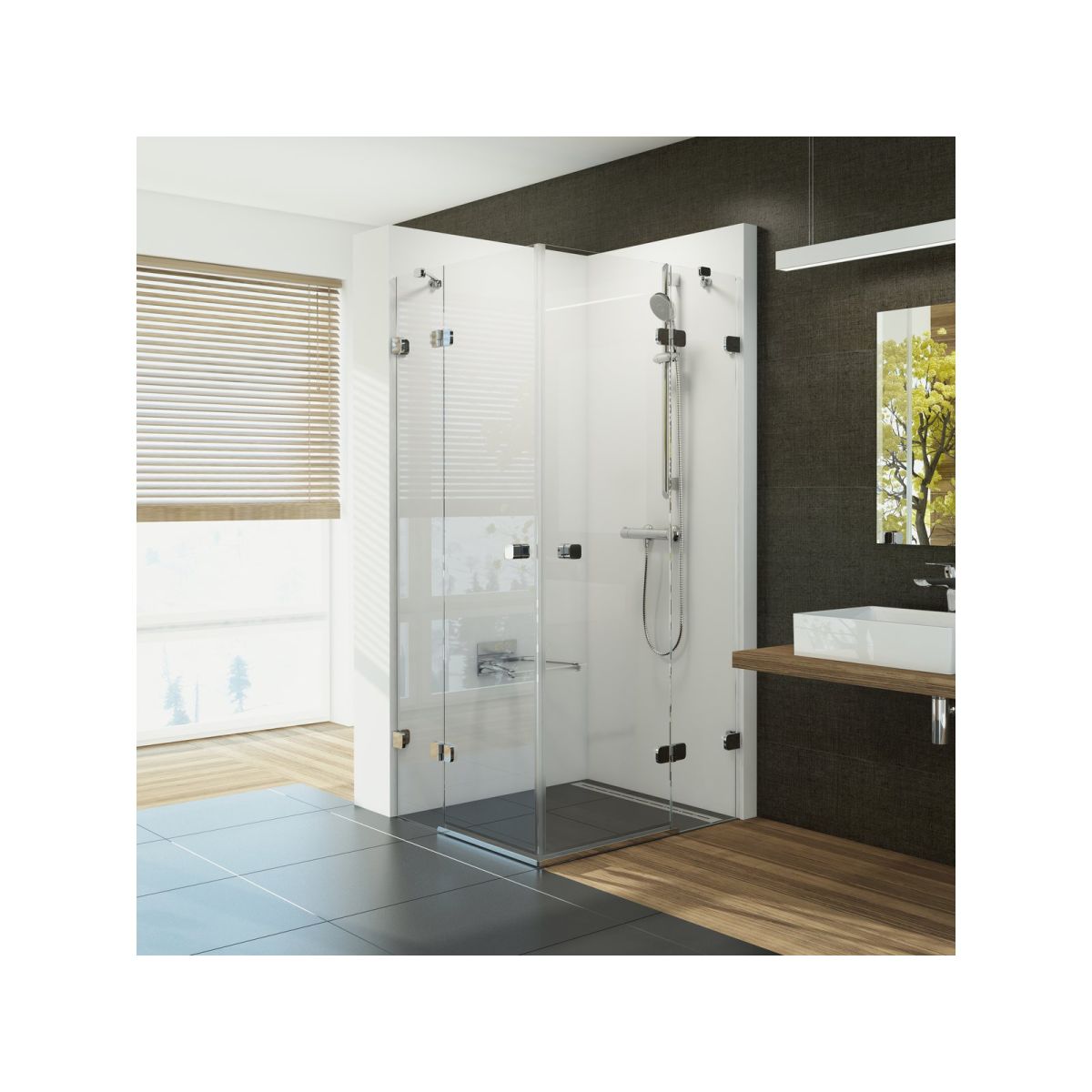 Pánty sú zapustené do skla vnútri sprchového kúta, čo výrazne uľahčuje údržbu. Zdvihací mechanizmus zabezpečuje, že dvere sa pri otváraní a zatváraní automaticky zatvárajú a zdvíhajú nad prahovú lištu. Čistý kov a pevná konštrukcia ergonomických kľučiek podčiarkujú majestátny dojem celého sprchového kúta.