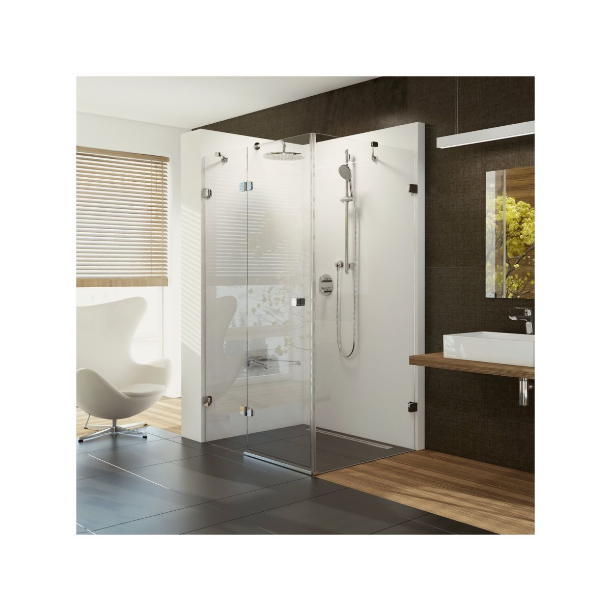 Pánty sú zapustené do skla vnútri sprchového kúta, čo výrazne uľahčuje údržbu. Zdvihací mechanizmus zabezpečuje, že dvere sa automaticky zatvárajú a pri otváraní a zatváraní sa zdvihnú nad prahovú lištu. Čistý kov a pevná konštrukcia ergonomických kľučiek zdôrazňujú majestátny dojem celého sprchového kúta.