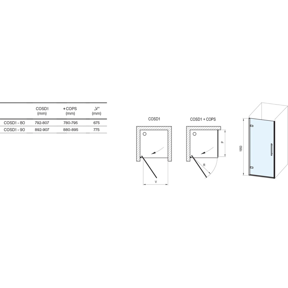 - dvere je možné kombinovať s pevnou stenou COPS (80,90,100) a vytvoriť tak sprchový kút, stenu je potrebné zakúpiť samostatne!