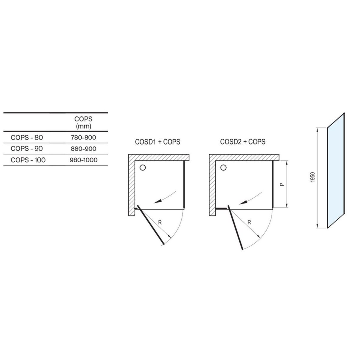 Výrobok sa skladá z jednej pevnej časti a je určený na kombináciu so sprchovými dverami (nie je samostatným výrobkom). Na obrázku je zobrazené kompletné riešenie. Uvedená cena je za samotnú stenu COPS.