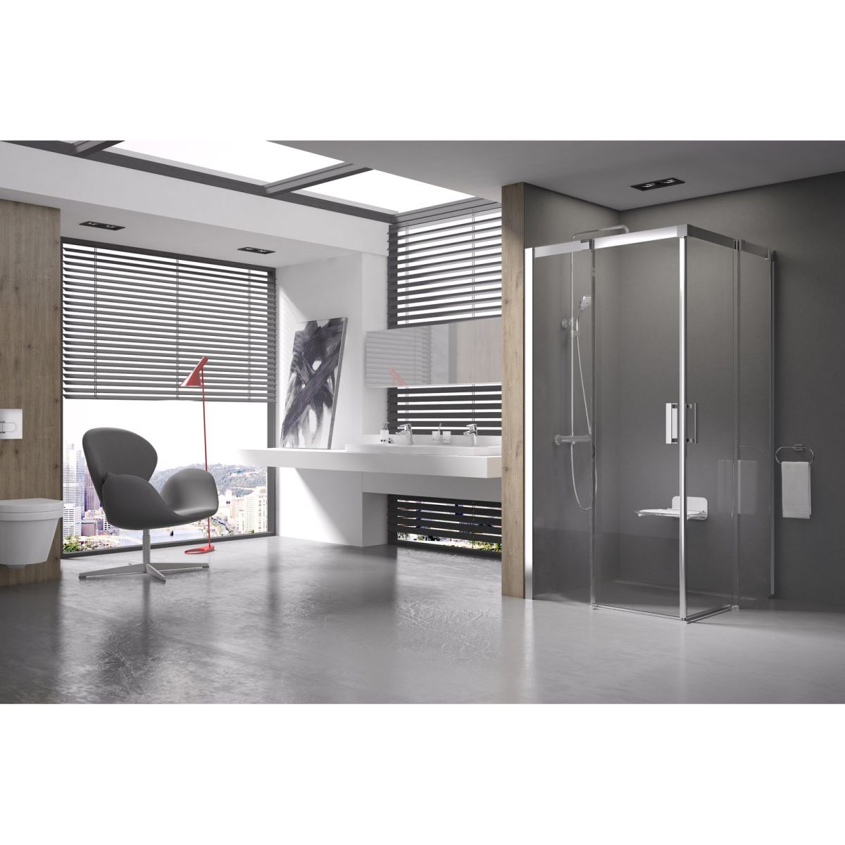 Štvordielny rohový sprchový kút Matrix v lesklej chrómovej úprave s priehľadnými sklenenými panelmi s ochrannou vrstvou Ravak AntiCalc®. Posuvný otvárací systém.