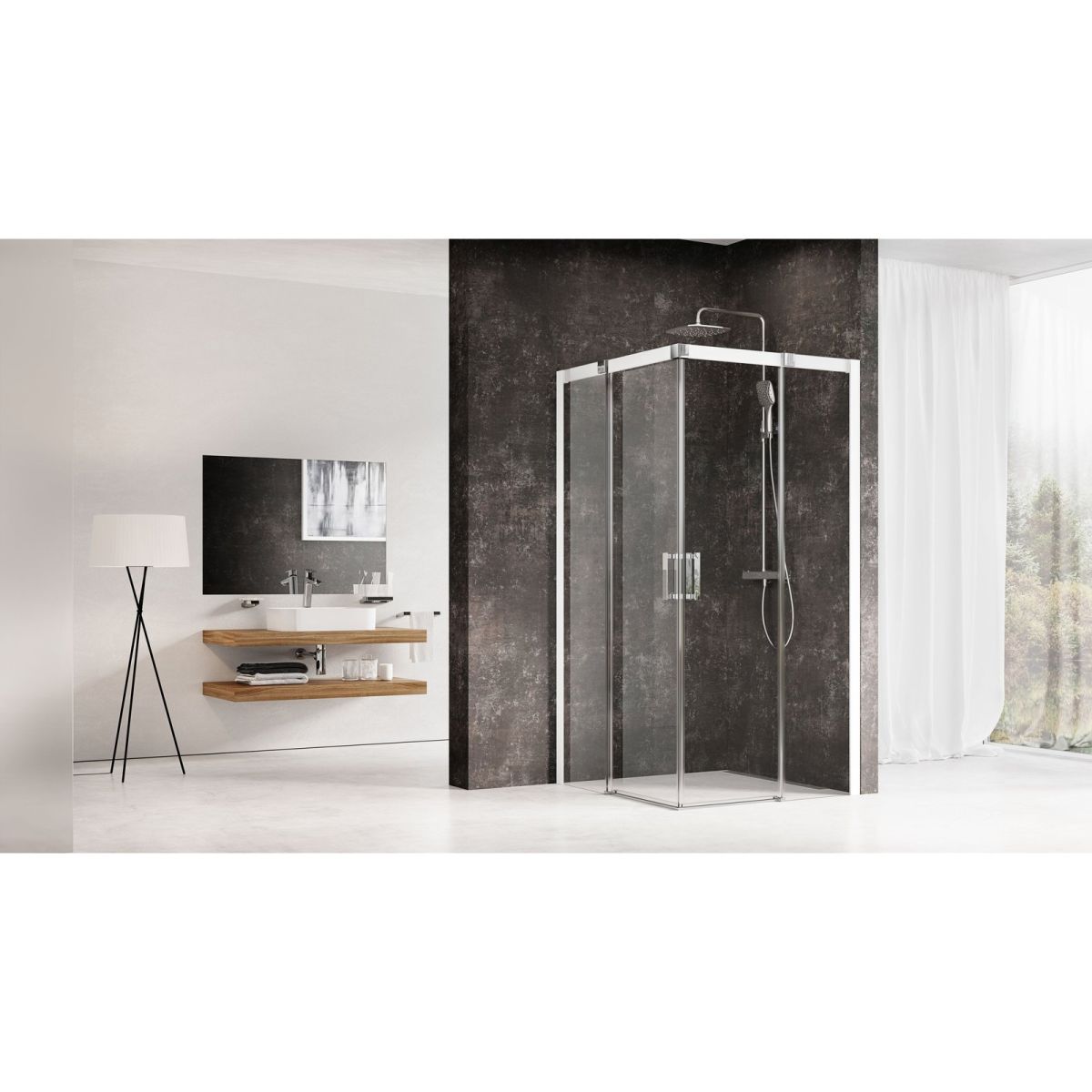 Kabinový systém sa skladá z dvoch priamych pevných panelov a dvoch priamych pohyblivých panelov, ktoré tvoria posuvné dvere. Inštalácia v kachličkovom rohu kúpeľne priamo na podlahe s vstavaným lineárnym odtokom alebo odtokovou mriežkou.