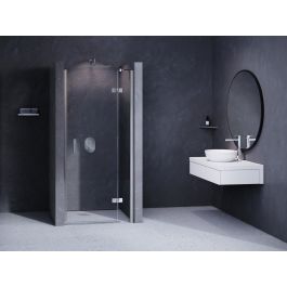 Dvojdielne sprchové dvere SmartLine v lesklej chrómovej úprave s priehľadným skleneným výplňou a ochrannou vrstvou Ravak AntiCalc®. Otvárací systém na pántoch. Verzia pre pravé otváranie.
