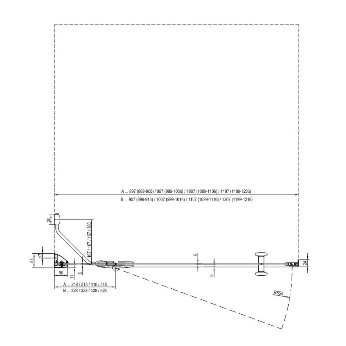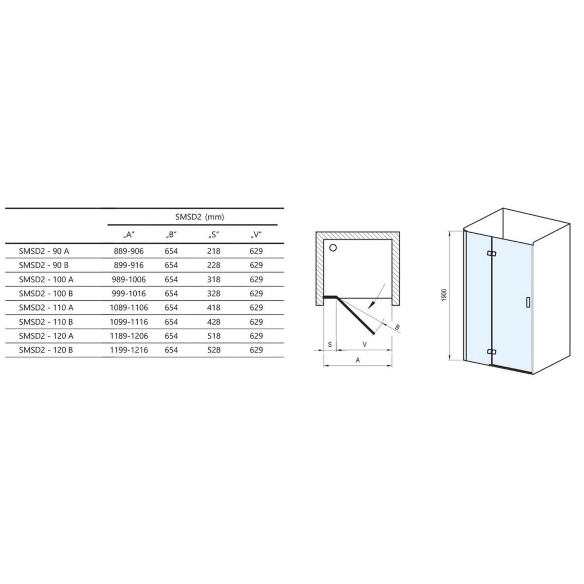 Inštalácia do výklenku na sprchovú vaničku Ravak: Angela, Perseus Pro, Perseus Pro Flat, Perseus Pro Chrome, Gigant Pro, Gigant Pro Flat, Gigant Pro Chrome alebo priamo na podlahu s vstavaným lineárnym odtokom alebo odtokovou mriežkou. Varianta A je určená pre stavebné otvory, ktoré sú o 11 mm menšie ako štandardné rozmery produktu. Pre pripojenie k pevnej stene odporúčame zvoliť dvere typu B.