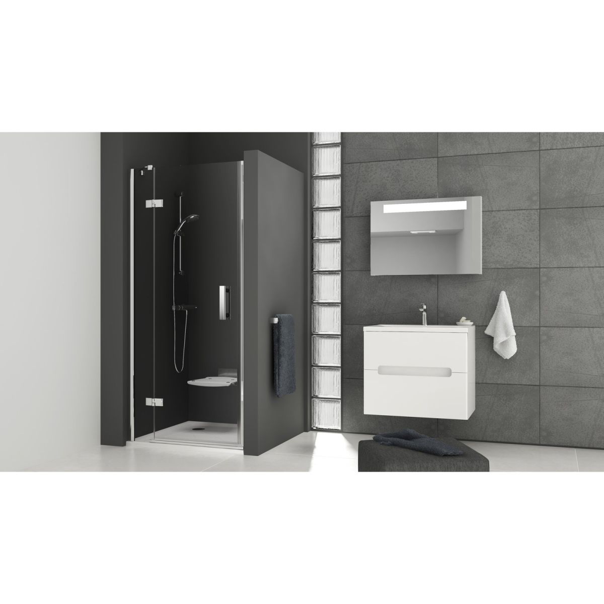 Dvojdielne sprchové dvere SmartLine v lesklej chrómovej úprave s priehľadným skleneným výplňou a ochrannou vrstvou Ravak AntiCalc®. Otvárací systém na pántoch. Verzia pre ľavú stranu.