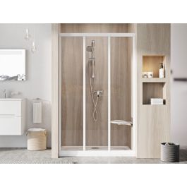 Trojdielne sprchové dvere Supernova v bielom vyhotovení s priehľadným skleneným výplňou a ochrannou vrstvou Ravak AntiCalc®. Posuvný otvárací systém. Výrobok nemá pravú ani ľavú verziu.