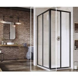 1/2 rohová sprchová zástena Supernova v čiernej farbe s priehľadnými sklenenými panelmi s ochrannou vrstvou Ravak AntiCalc®. Posuvný otvárací systém.