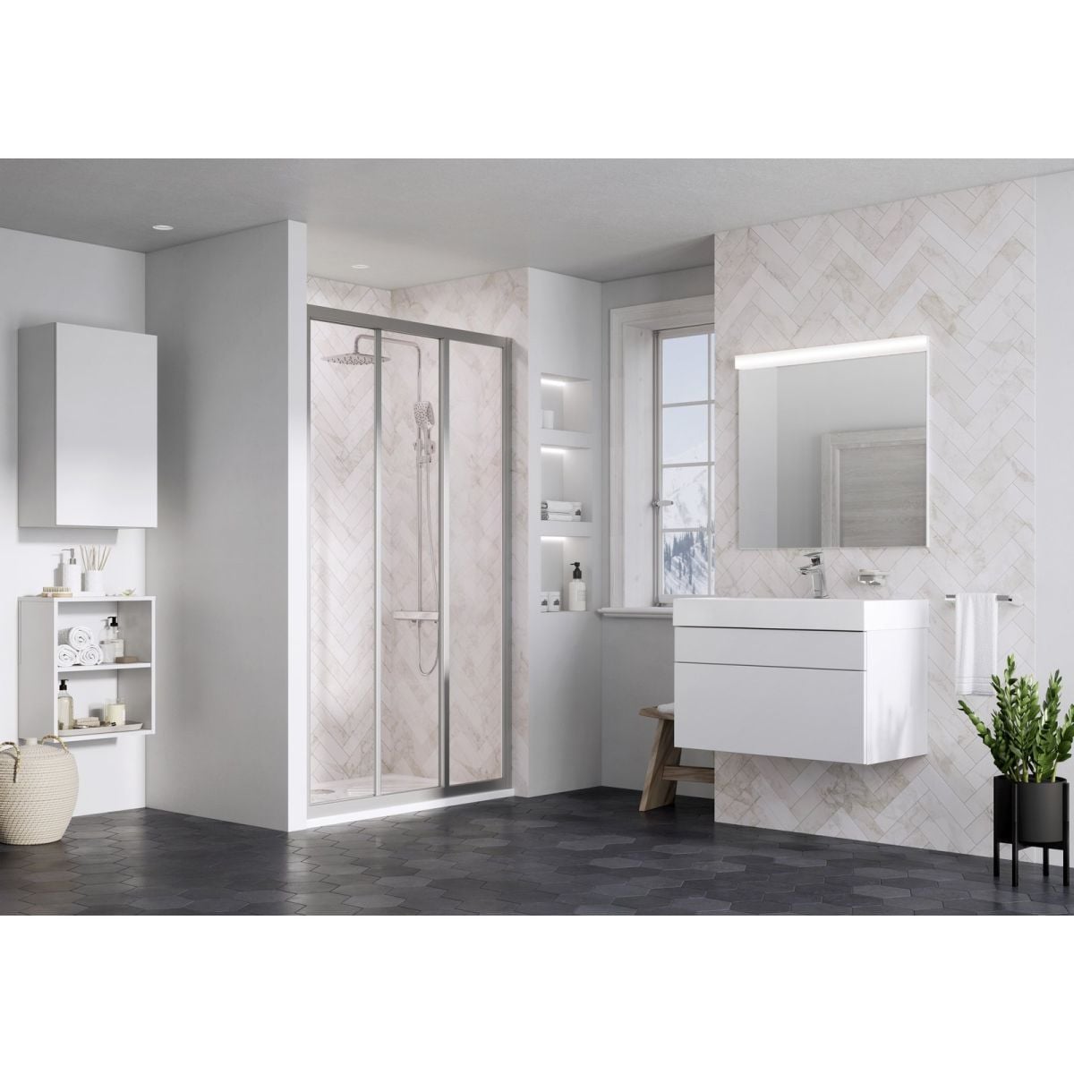 Trojdielne sprchové dvere Supernova v saténovom vyhotovení s priehľadným skleneným výplňou a ochrannou vrstvou Ravak AntiCalc®. Posuvný otvárací systém. Výrobok nemá pravú ani ľavú verziu.