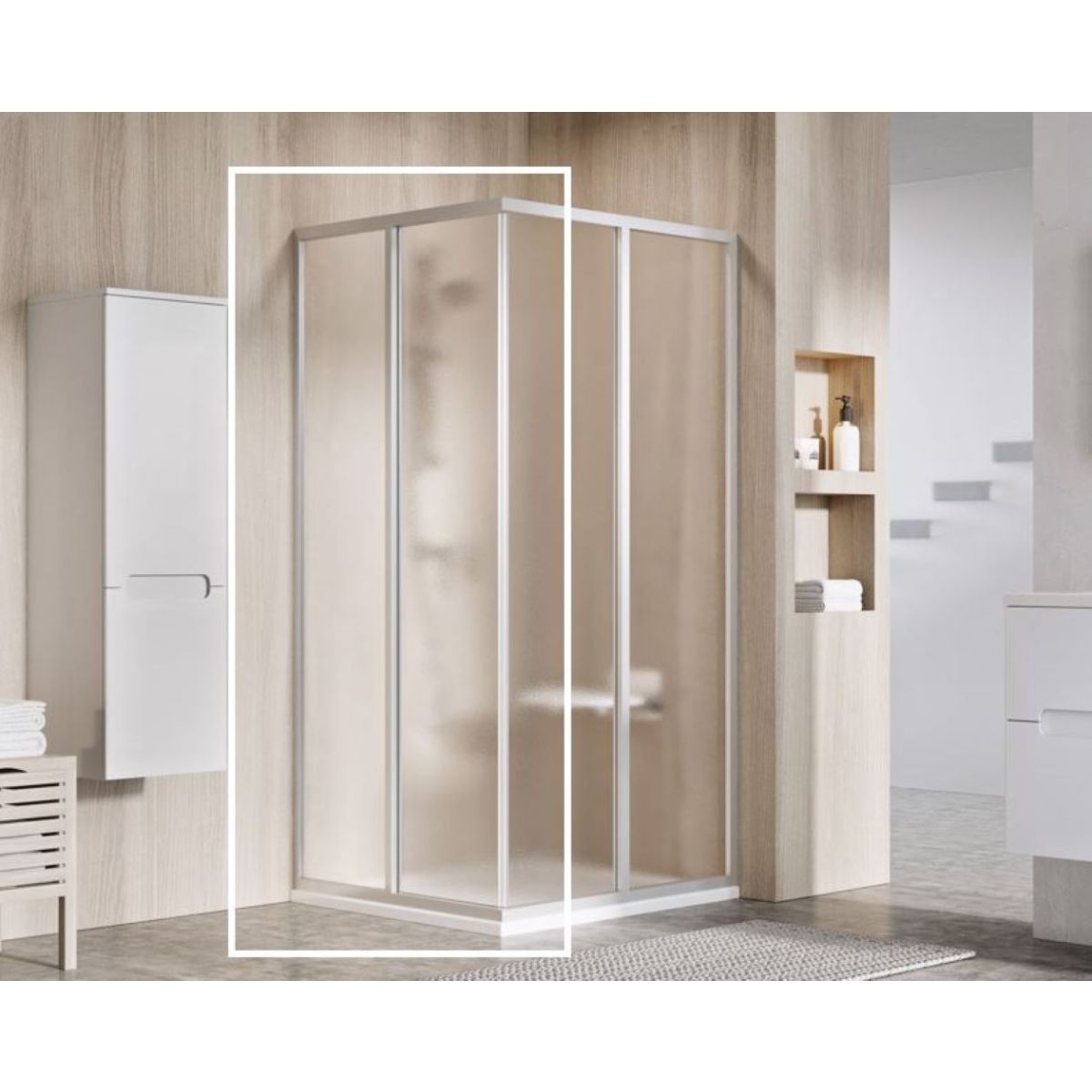 1/2 rohová sprchová zástena Supernova v saténovom vyhotovení s nepriehľadným sklom Grape s ochrannou vrstvou Ravak AntiCalc®. Posuvný otvárací systém.