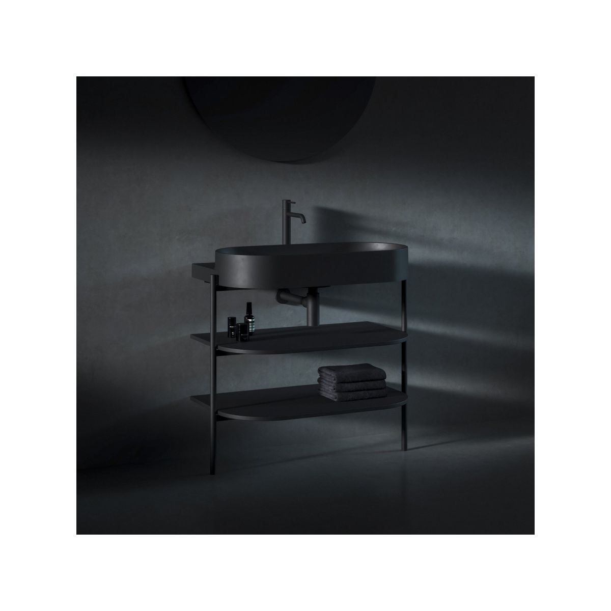 Tenkostenné keramické umývadlo Yard určené na montáž na konzolu alebo dosku Yard, bez prepadu. Farba matná čierna. S otvorom na vodovodnú batériu.