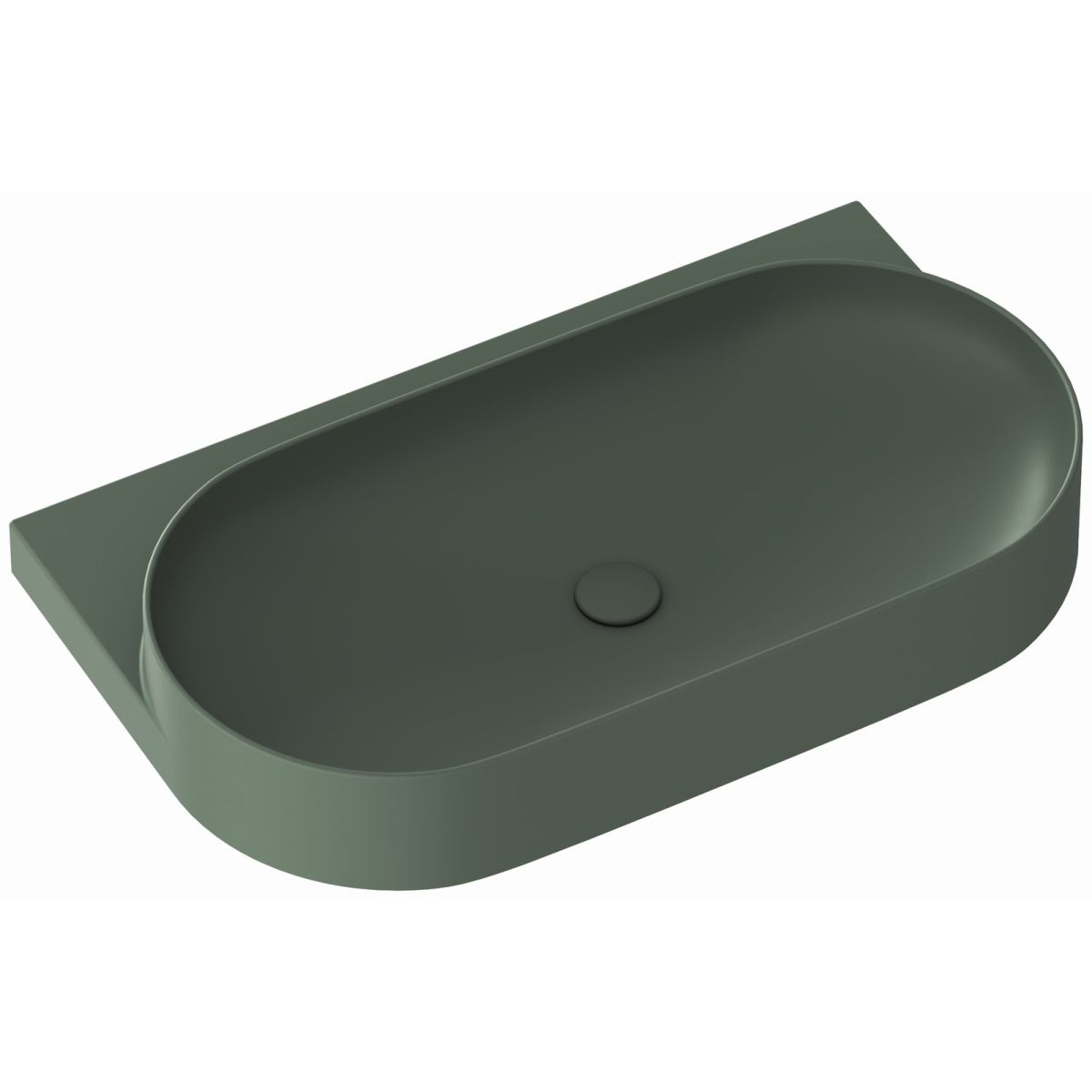 Keramické tenkostenné umývadlo Yard určené na montáž na konzolu alebo dosku Yard bez prepadu. Farba sivozelená. S otvorom pre batériu.