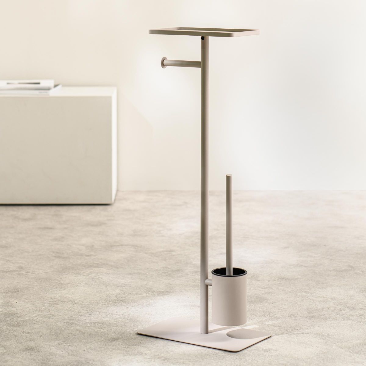 Multifunkčný toaletný stojan s držiakom na papier, kefou a poličkou – štýl a pohodlie v kašmírovej farbe