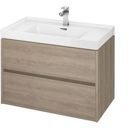 Súprava obsahuje závesnú umývadlovú skrinku CREA 80 s nábytkovým umývadlom CREA 80. Čelo a korpus skrinky sú vyrobené z drevotrieskovej dosky odolnej proti vlhkosti vo farbe dub. Skrinka je vybavená dotykovým systémom otvárania (tzv. PUSH SYSTEM) a dvoma objemnými zásuvkami. Interiér so štruktúrou sivého plátna dodáva skrinke mimoriadne elegantný vzhľad. Umývadlo CREA je vyrobené z keramiky ROCKLITE, vďaka čomu je prekvapivo pevné, ľahké a s mimoriadne tenkými stenami.