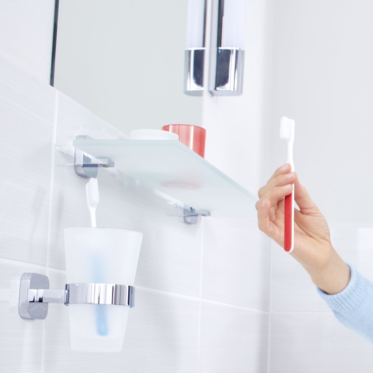 Elegantný nástenný držiak so skleneným pohárom poskytuje atraktívne miesto na uloženie zubnej kefky a pasty. Sklenený pohár so saténovou povrchovou úpravou je dokonalým doplnkom k držiaku z vysokolesklého chrómu s racionálnym štvorcovým tvarom. Jeho inštalácia pomocou samolepiaceho riešenia je bezpečná a mimoriadne jednoduchá. Použitie vŕtačky nie je potrebné. Výsledkom je, že povrch stien alebo obkladov zostáva neporušený. Držiak možno kedykoľvek odobrať a upevniť na iné miesto pomocou nového adaptéra BK20.