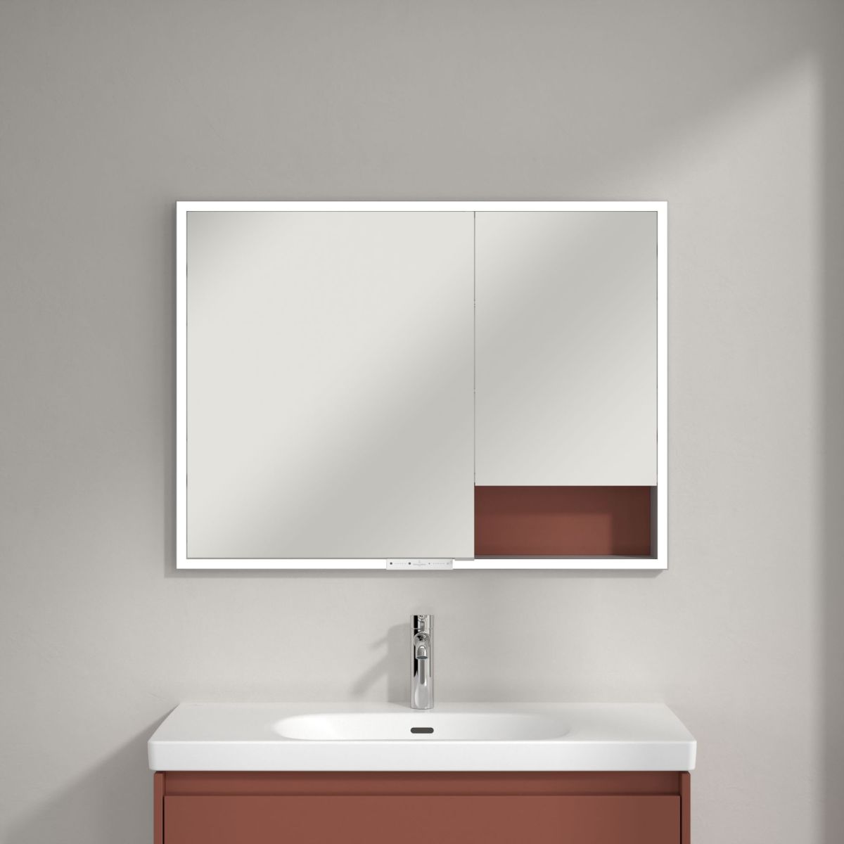 Dômyselné a atraktívne riešenie pre minimalistické kúpeľne – vstavaná zrkadlová skrinka My View+ od spoločnosti Villeroy & Boch prináša do kúpeľne inteligentné funkcie a štýlové farebné akcenty, čím stanovuje nové štandardy. Skriňa s uzavretými úložnými priestormi a otvorenými priehradkami sa dokonale integruje do steny a vytvára mimoriadne elegantný minimalistický efekt. Farebný zadný panel dodáva kúpeľni individuálny nádych farby a dizajnu.