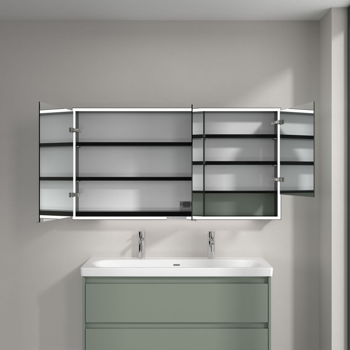 LED pásik obklopujúci zrkadlo zaisťuje rovnomerné osvetlenie, zatiaľ čo integrované osvetlenie umývadla a osvetlené otvorené priehradky vytvárajú útulnú atmosféru. Jas a farebnú teplotu možno pohodlne nastaviť pomocou senzora alebo ovládača Smart Home. Jemné úchytky umožňujú pohodlné otváranie dvierok bez zanechania odtlačkov prstov a dvojitá zásuvka uprostred poskytuje dodatočnú funkčnosť.