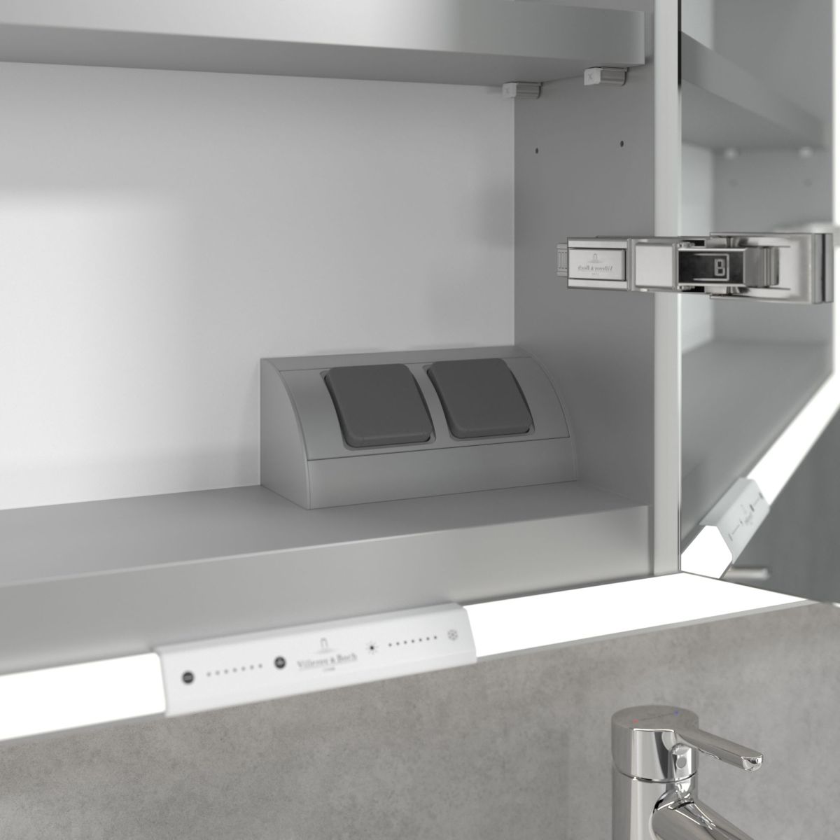 LED pásik obklopujúci zrkadlo zaisťuje rovnomerné osvetlenie, zatiaľ čo integrované osvetlenie umývadla a osvetlené otvorené priehradky vytvárajú útulnú atmosféru. Jas a farebnú teplotu možno pohodlne nastaviť pomocou senzora alebo ovládača Smart Home. Jemné úchytky umožňujú pohodlné otváranie dvierok bez zanechania odtlačkov prstov a dvojitá zásuvka uprostred poskytuje dodatočnú funkčnosť.