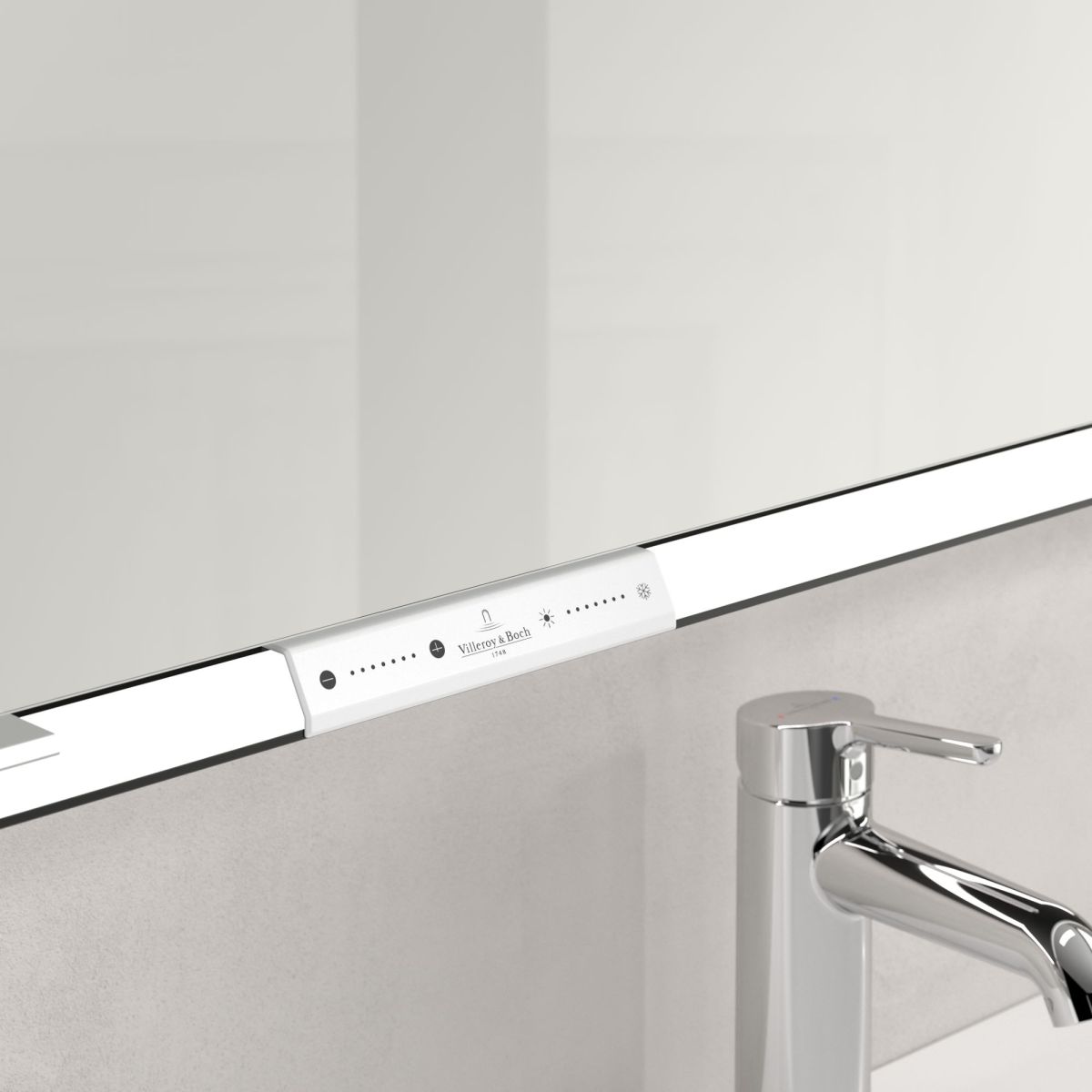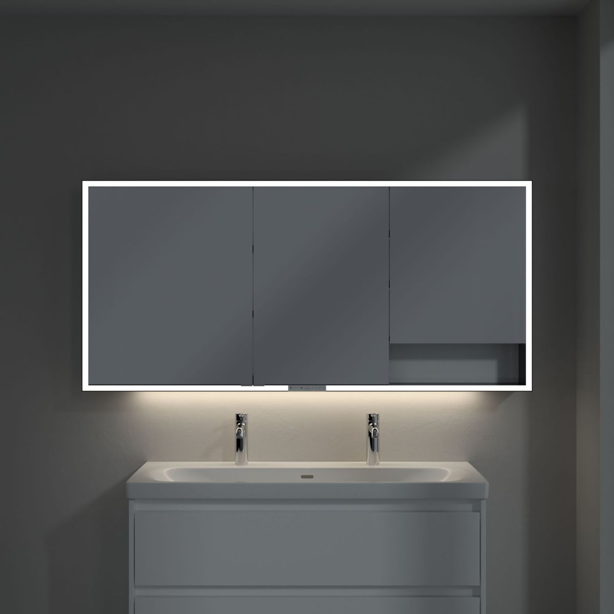 LED pásik obklopujúci zrkadlo zaisťuje rovnomerné osvetlenie, zatiaľ čo integrované osvetlenie umývadla a osvetlené otvorené priehradky vytvárajú útulnú atmosféru. Jas a farebnú teplotu možno pohodlne nastaviť pomocou senzora alebo ovládača Smart Home. Jemné úchytky umožňujú pohodlné otváranie dvierok bez zanechania odtlačkov prstov a dvojitá zásuvka uprostred poskytuje dodatočnú funkčnosť.