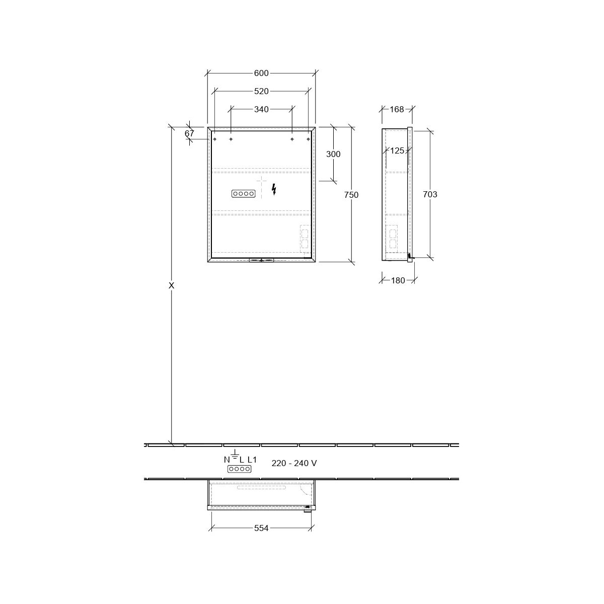 - príslušenstvo: 1 x dvere, 1 x senzorový spínač na vonkajšej strane, 2 x zásuvky na vnútornej strane, 2 x hliníkové police, 1 x kontajner, 1 x zväčšovacie zrkadlo, 1 x magnetický pásik