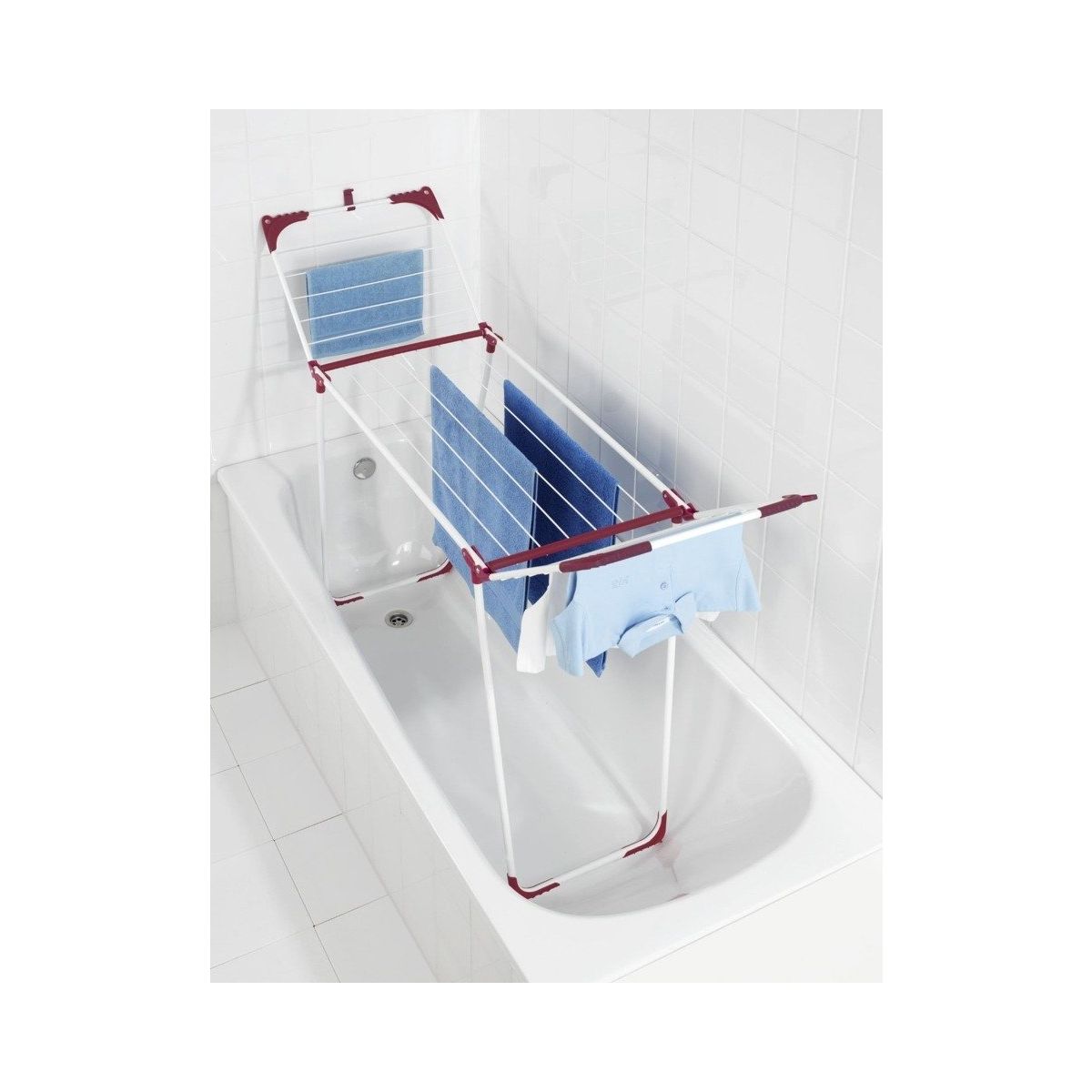 Sušička bielej farby. Celková plocha sušičky je 13 metrov. Vybavená jednoduchým mechanizmom na rozkladanie a skladanie. Šírka umožňuje umiestnenie sušičky kdekoľvek, napr. vo vani.